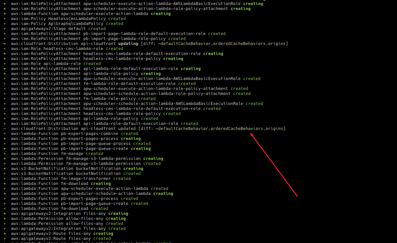 As we can see, all of the resources will be recreated, except for the api-cloudfront one, which shows changes in the defaultCacheBehavior,orderedCacheBehaviors,origins.